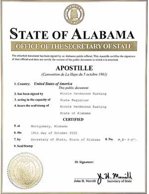 Alabama apostilles can be obtained to authenticate Alabama vital records, Alabama university diplomas and school transcripts, Certificates of Existence (Good Standing), divorce certificates, notarized powers of attorney and other notarized and public documents.