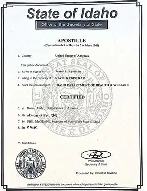 An Idaho Apostille is a certificate that is affixed by the Idaho Secretary of State to a public document. It certifies the authenticity of the signature appearing on the document as that of an authorized Idaho public official and confirms the capacity of that official (e.g. State Registrar, notary public).